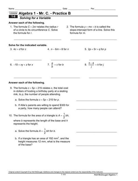 Holt Mcdougal Algebra Lesson 1 2 Practice C